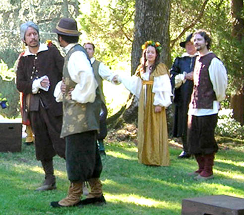 Then there are the Shakespeare comedies. “With a hey and a ho, and a hey-nonny no”. “As You Like It” is one of Shakespeare’s comedies. It is the story of the romance between Rosalind and Orlando. The play starts out in the town, but Rosalind is banished to the forest of Arden where she disguises herself as a man called Ganymede. The confusion that results from a woman dressed up as a man was always a crowd pleaser for Elizabethan play-going audiences, probably still is today. Rosalind takes along her cousin Celia, the daughter of the Duke, to the forest. Soon nearly everyone is in the forest, and there is romance in the air. For the men, Shakespeare throws in some wrestling and some deer hunting. Of course Rosalind first notices Orlando while he is wrestling, so the wrestling might be for the ladies too. Couples bump into each other at will and exchange playful lines. And always in the woods, there are minstrels ready to break out in song with the least provocation. The play is high-spirited or to use the nearly archaic word, merry.