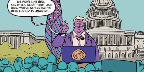 This graphic non-fiction presents itself as a mock users’ manual for would-be dictators in the future. Some of the authoritarian techniques discussed are “Attack the press”, “Make it entertaining”, “Symbols and slogans”, “Personality cult”, “Gut all institutions of accountability”, “Get the opposition to appease you”, “Turn average citizens into troops”, “Pack the courts”, and “The Big Lie”. The book discusses the various brutal methods that such infamous dictators as Josef Stalin, Adolf Hitler, Vladimir Putin, Kim Il Sung, Benito Mussolini, and Idi Amin used to suppress and murder their own people and stay in power. Two things that sustain a dictator is a love of power and an absence of shame.